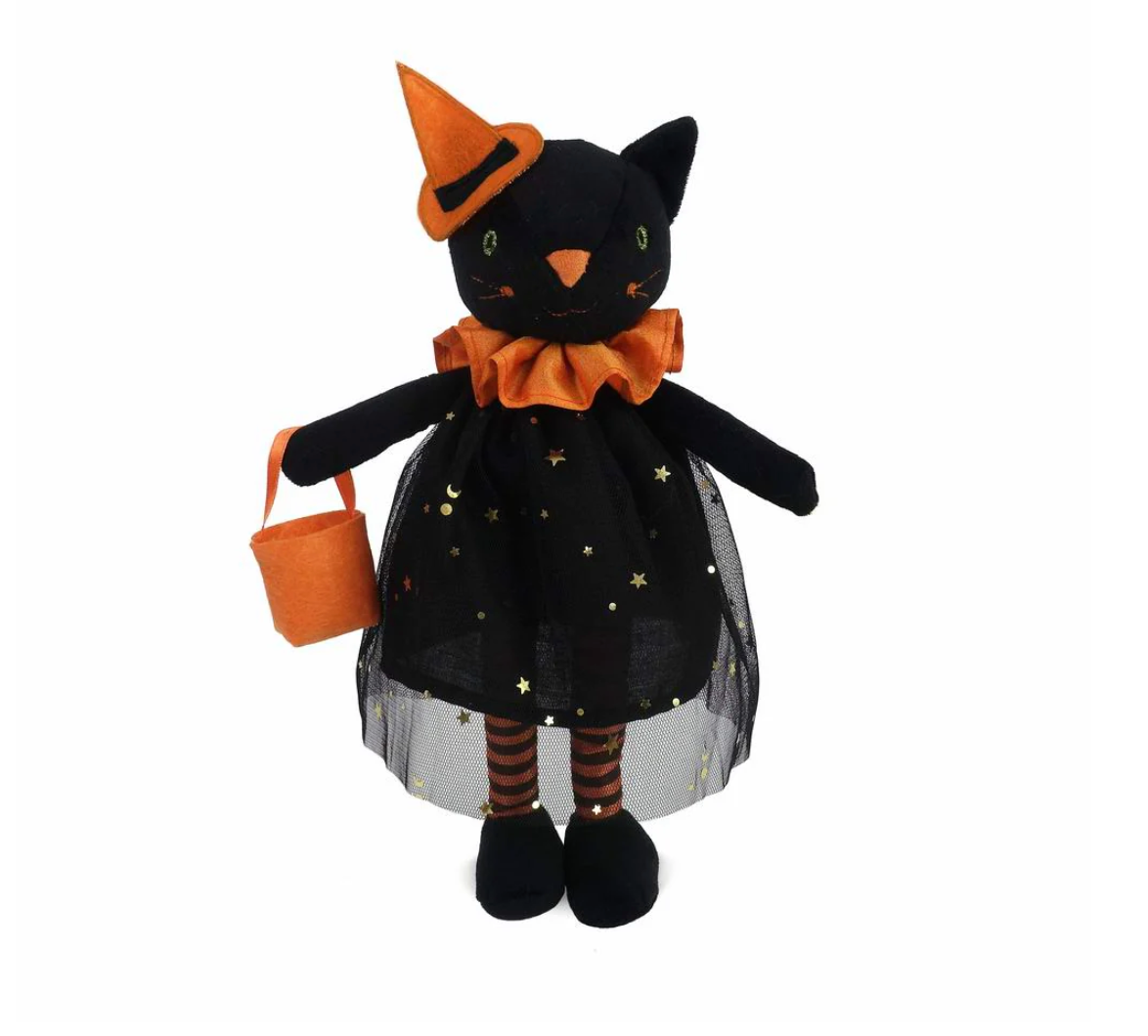 Sweet embroidered face with festive striped legs, pointy hat, and goodie bag...Dorrie Cat Witch is enchanting fun!
