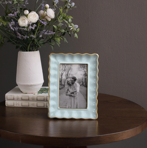 Beatriz Ball's Frame Encanto Devon 4 x 6" is positively alive with scalloped texture and form, strikingly presented in colorfully enameled metal rimmed in gold. With an enchantingly tailored shape, the frame is ideal for displaying your favorite 4x6 photo in style. Of heirloom quality, this frame may be displayed vertically or horizontally, and makes a perfect gift for any occasion. This handsome enameled frame will add a distinctive decorative touch to any room and will be cherished for years to come.