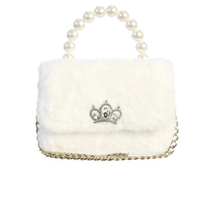 The perfect accessory for your little princess. Adorable soft faux fur purse with a sparkling tiara rhinestone accent and magnetic closure. It has a lovely pearl handle and a detachable gold chain strap.