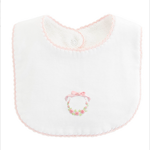 Beautiful and delicate design of embroidered roses with a pink ribbon bow, our bib made with 100% Peruvian Pima Cotton interlock is the perfect accompaniment for your babies everyday wear. It has terry backing and a snap closure with pink crochet trim.