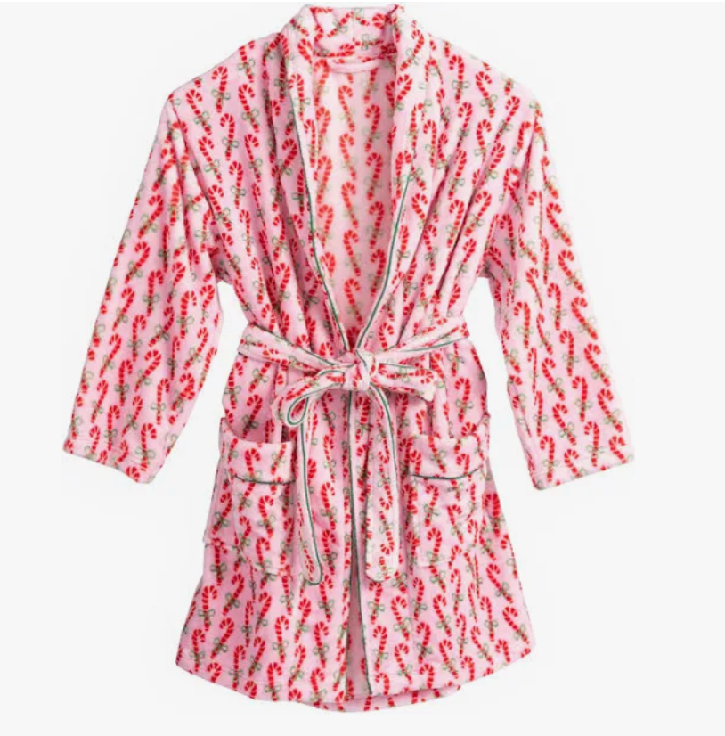 Add a festive and luxurious touch to your loungewear with this Candy Cane Robe. The adorable light pink robe features a pattern of red striped candy canes tied with a green bow - perfect to wear while you open up presents by the tree. This soft and fuzzy robe features two front pockets and an adjustable wrap around belt, allowing you to be cozy and casual throughout your holiday celebrations.