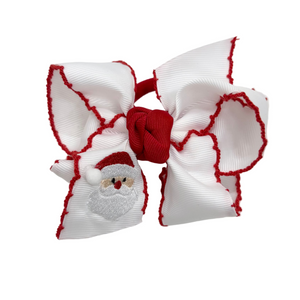 White bows with crochet edge and Christmas image embroidered. The bow is large 4.5” and is attached to a soft pantyhose headband. One size fits most.
