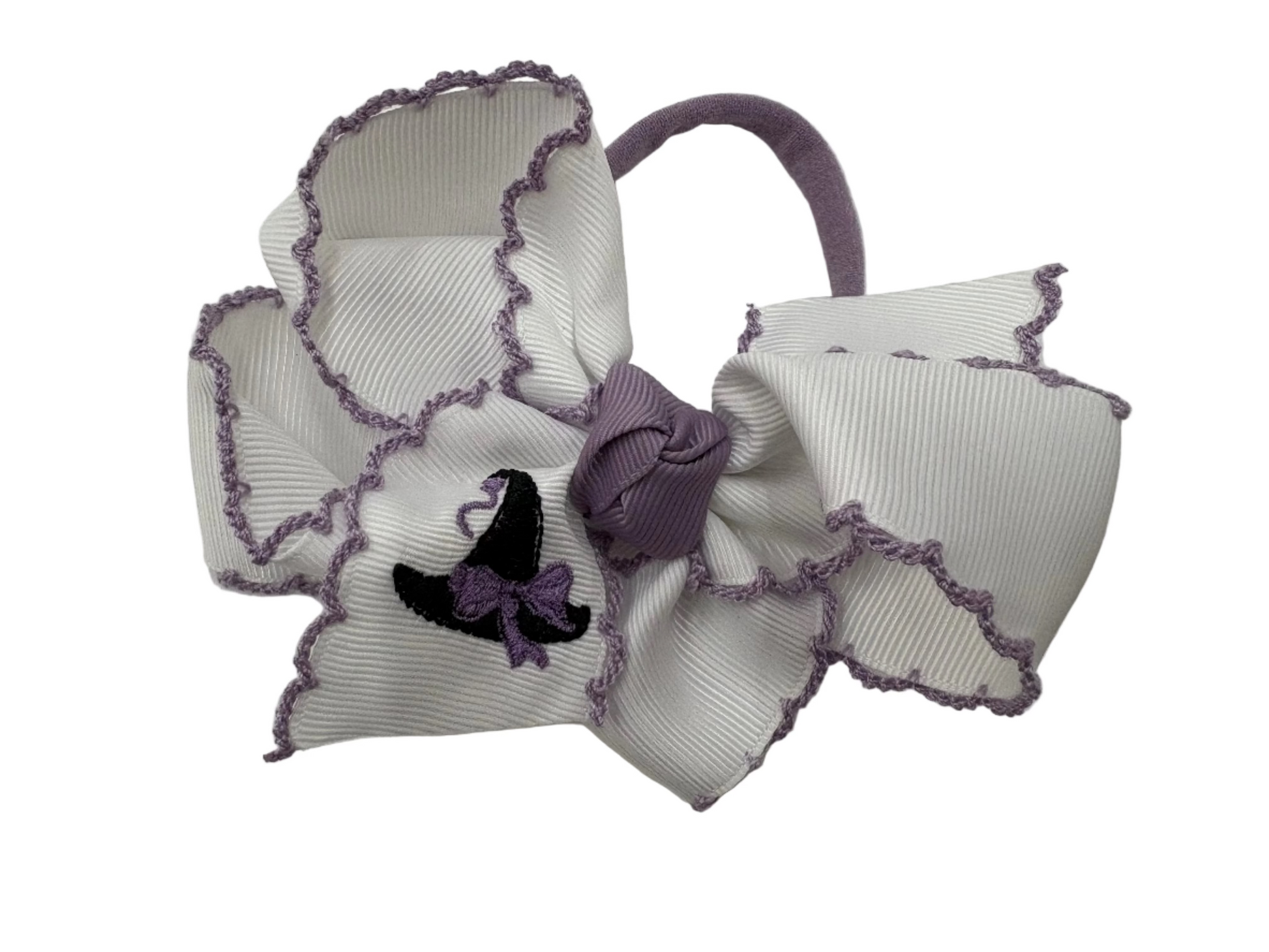 Bows with crochet edge and Halloween image embroidered. The bow is large 4.5” and is attached to a soft pantyhose headband. One size fits most.