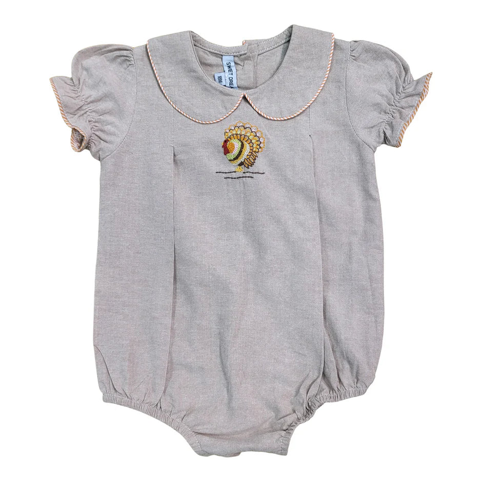 Darling brown chambray bubble with turkey and peter pan collar and puff sleeves