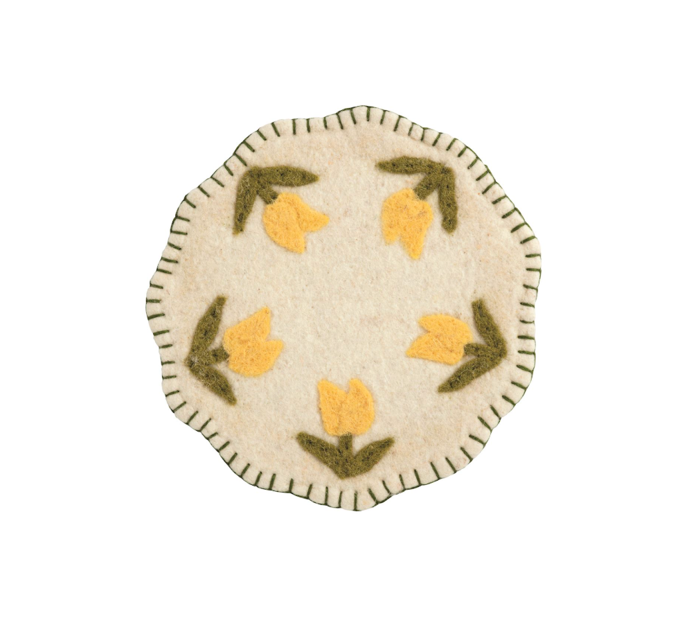 Felted Floral Trivet is a beautifully crafted piece designed to add both functionality and style to your kitchen or dining area. Made from 100% wool, this trivet features a charming scallop edge that enhances its aesthetic appeal. The intricate blue floral design is felted into the wool, providing a unique and elegant touch that complements a variety of home decors. With a diameter of 8 inches, it offers ample space to protect your surfaces from hot pots, pans, and dishes. The natural wool material not only provides excellent heat resistance but also adds a soft, tactile element to your table setting. Perfect for everyday use or special occasions, this trivet is a practical and decorative addition to any home.