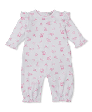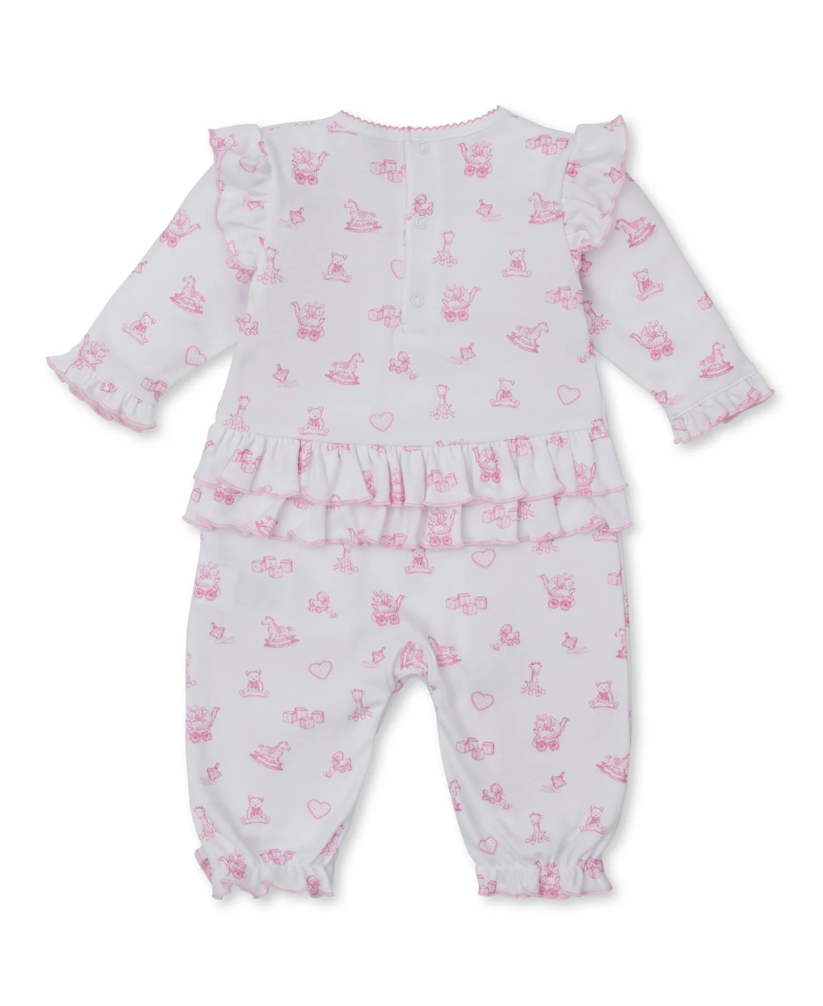 Our vintage toy treasures print covers this cute playsuit that is perfect for play. Made from the softest Pima cotton for ultimate comfort and featuring fun ruffles for baby.