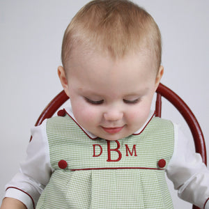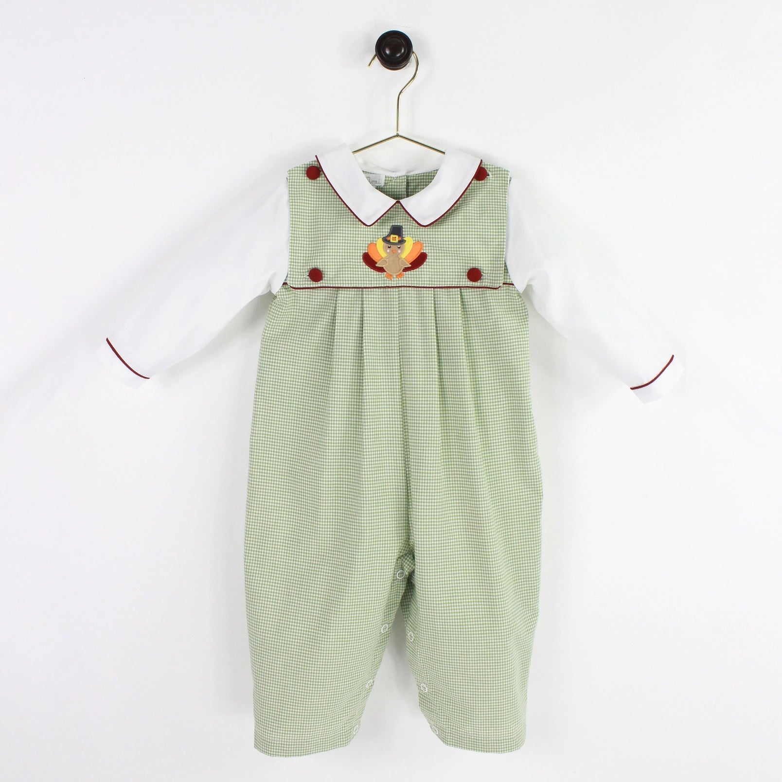 Our Thanksgiving longall with removable bib features a turkey embroidery on the bib which then can be buttoned off for a plain longall that is perfect for monogramming.