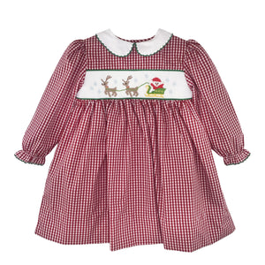 This long sleeve dress comes in a red and white check fabric with a hand picture smocked scene of Santa's sleigh with his reindeer. A white peter pan collar with green picot trim completes the look.