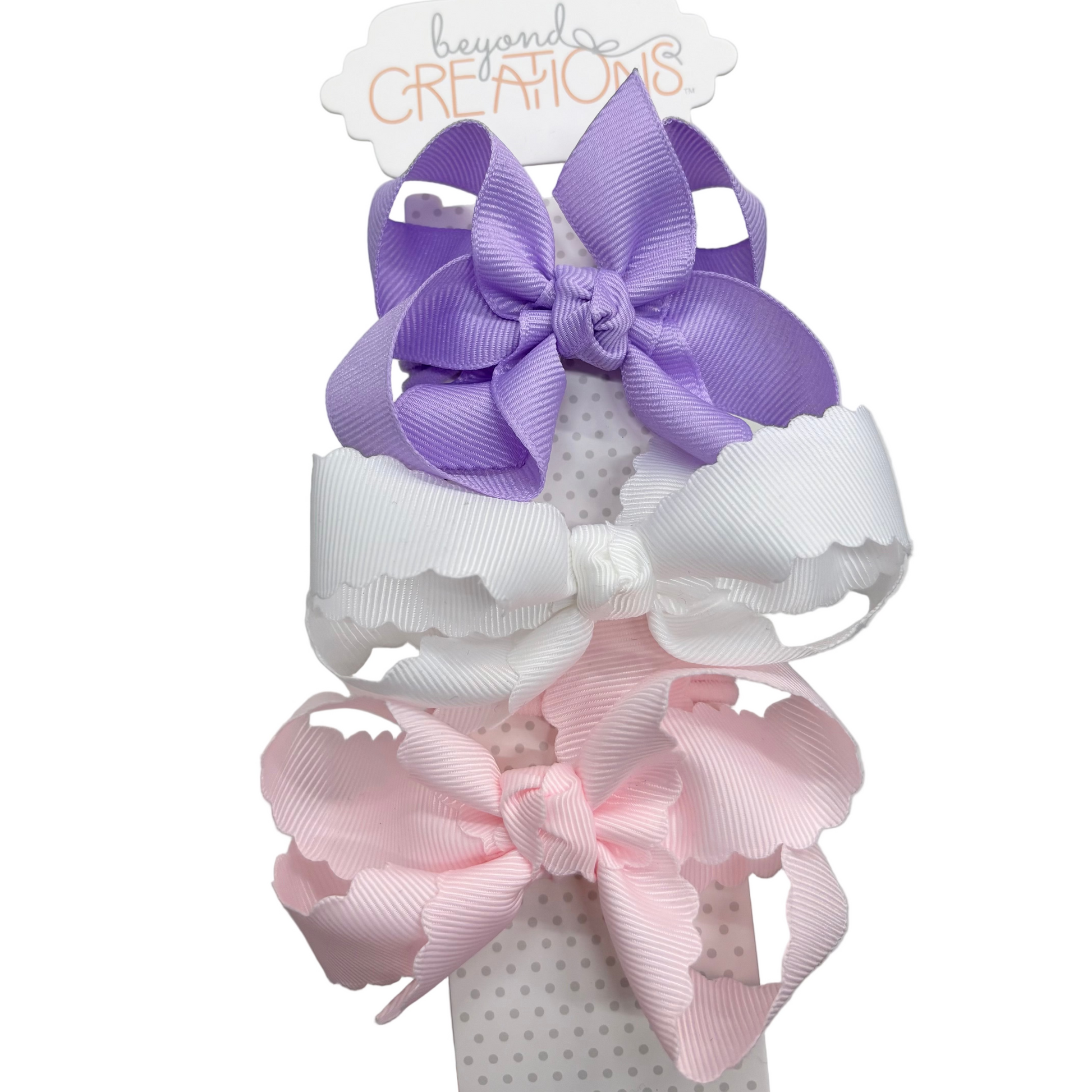 Two medium 3.5" scalloped edge bows in white and powder pink and one small 3" bow in lavender.