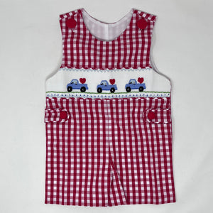 Adorable red and white checked short jon jon with smocking. Three blue trucks with red hearts embellish this romper.