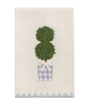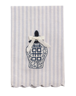 Woven yarn-dyed stripe towel features embroidered icon with dimensional embellishments.