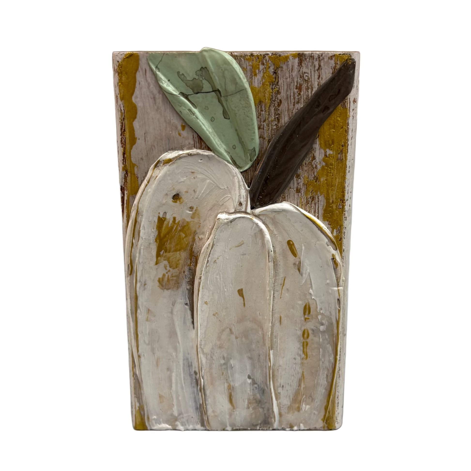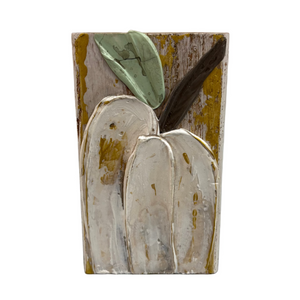 Hand-painted art by Susan Hood featuring a white pumpkin on a wooden block for a touch of rustic fall charm.